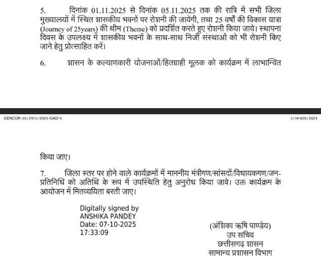 5. रोशनी व्यवस्था: 01.11.2025 से 05.11.2025 तक की रात्रियों में सभी जिला मुख्यालयों के शासकीय भवनों पर "25 वर्षों की विकास यात्रा" थीम के आधार पर आकर्षक रोशनी की जाएगी। निजी संस्थानों को भी इस अवसर पर अपने भवनों को रोशनी से सजाने के लिए प्रोत्साहित किया जाएगा।