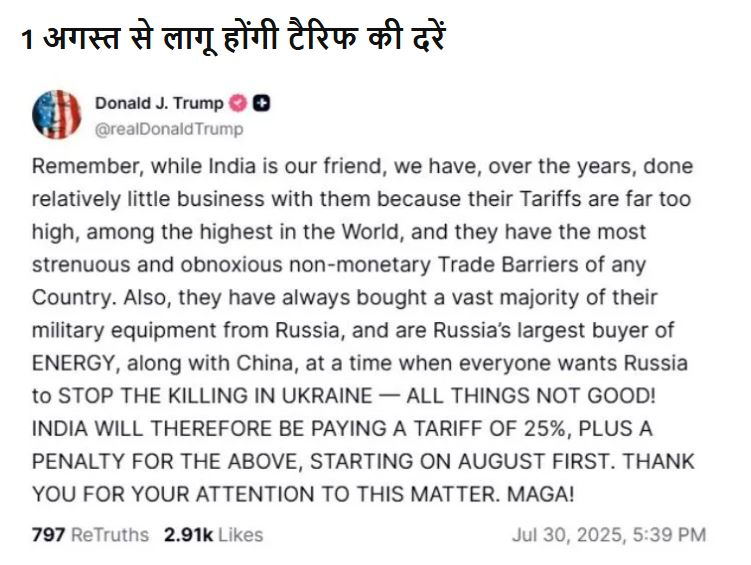 ट्रंप ने आगे लिखा, साथ ही, उन्होंने हमेशा अपने सैन्य उपकरणों का एक बड़ा हिस्सा रूस से खरीदा है। चीन के साथ-साथ वह रूस से ऊर्जा का सबसे बड़े खरीदार हैं। ऐसे समय में जब हर कोई चाहता है कि रूस यूक्रेन में हत्या बंद करे- सभी चीजें अच्छी नहीं हैं! इसलिए भारत 1 अगस्त से 25% का टैरिफ और साथ ही जुर्माना भी चुकाएगा। इस मामले पर आपके ध्यान के लिए धन्यवाद।" डोनाल्ड ट्रंप ने यूएस रेसिप्रोकल टैरिफ की डेडलाइन से 2 दिन पहले यह घोषणा की है। ट्रंप ने यह घोषणा अपने सोशल मीडिया प्लेटफॉर्म ट्रुथ सोशल पर की है।