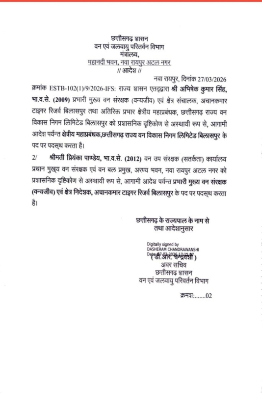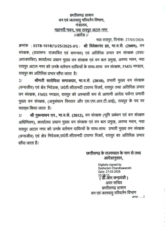 विवेकानंद झा (2009 बैच) को उनके वर्तमान दायित्वों के साथ वन संरक्षक, FMIS मंडल, रायपुर का अतिरिक्त प्रभार दिया गया। सतोविशा समाजदार (2010 बैच) को अस्थायी रूप से प्रभारी मुख्य वन संरक्षक (अनुसंधान, विस्तार एवं एफआरटीआई), रायपुर की जिम्मेदारी दी गई। गुरुनाथन एन. (2012 बैच) को प्रभारी मुख्य वन संरक्षक (वन्यजीव) और क्षेत्र निदेशक, उदंती-सीतानदी टाइगर रिजर्व, रायपुर का अतिरिक्त प्रभार सौंपा गया। प्रियंका पाण्डेय (2012 बैच) को प्रभारी मुख्य वन संरक्षक (वन्यजीव) और क्षेत्र निदेशक, अचानकमार टाइगर रिजर्व, बिलासपुर का नया दायित्व मिला।