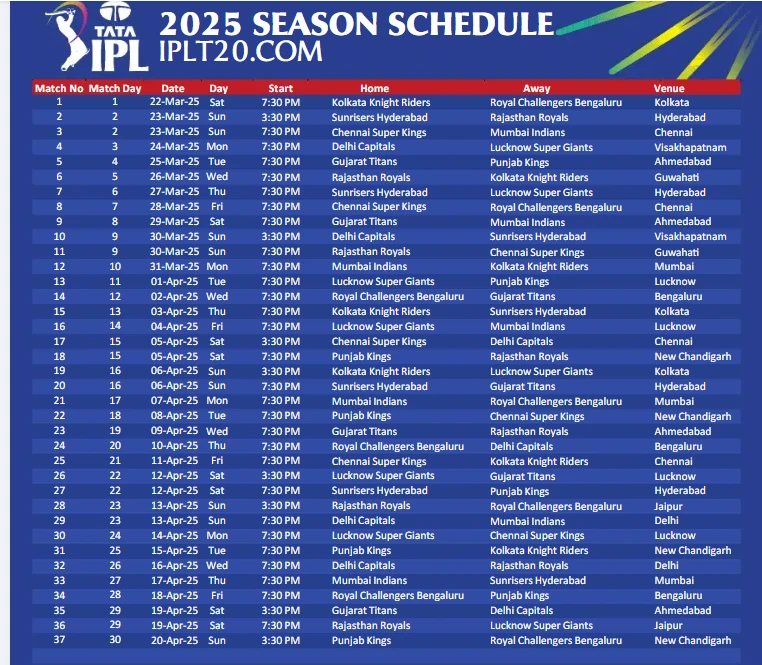 IPL 2025 Schedule: फाइनल मैच भी 25 मई को ईडन गार्डंस में ही होगा। इस सीजन में 13 शहरों में 65 दिनों के दौरान कुल 74 मैच खेले जाएंगे, जिसमें लीग राउंड और नॉकआउट चरण शामिल हैं। 22 मार्च से 18 मई तक 70 लीग मैच होंगे, जबकि प्लेऑफ और फाइनल 20 से 25 मई के बीच खेले जाएंगे।