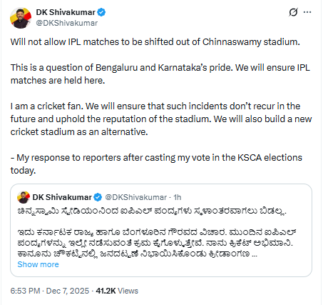 IPL 2026 Chinnaswamy Stadium: केएससीए अध्यक्ष चुनाव के दौरान मतदान करने पहुंचे शिवकुमार ने कहा कि राज्य सरकार स्टेडियम के संचालन, सुरक्षा व्यवस्था और दर्शक प्रबंधन को और मजबूत करेगी। उन्होंने बताया कि बेंगलुरु में एक बड़े और आधुनिक क्रिकेट स्टेडियम के निर्माण पर भी विचार चल रहा है। उपमुख्यमंत्री ने कहा, “मैं क्रिकेट का बड़ा प्रशंसक हूं। हम यह सुनिश्चित करेंगे कि चिन्नास्वामी में भविष्य में कोई हादसा न हो और बेंगलुरु की पहचान हर आयोजन में बनी रहे।”