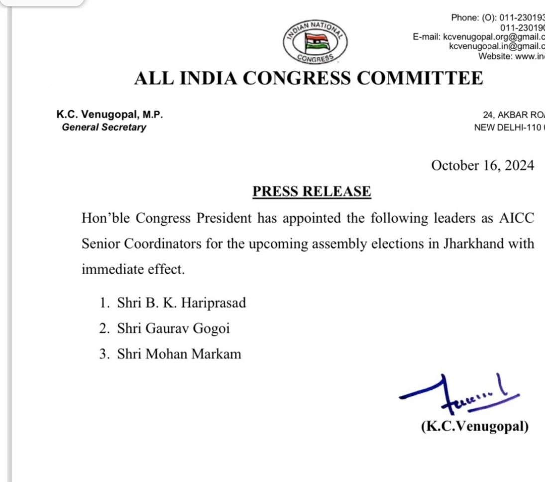 Jharkhand Election: नई दिल्ली। कांग्रेस ने झारखंड विधानसभा चुनाव को लेकर पर्यवेक्षकों की नियुक्ति कर दी है। कांग्रेस अध्यक्ष मल्लिकार्जुन खड़गे ने अखिल भारतीय कांग्रेस कमेटी (AICC) के वरिष्ठ समन्वयक, बीके हरिप्रसाद, गौरव गोगोई और मोहन मार्कम को तत्काल प्रभाव से झारखंड विधानसभा चुनाव के लिए पर्यवेक्षक नियुक्त किया है।