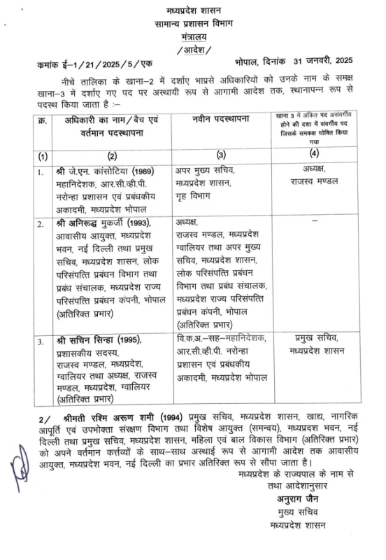 एमपी सरकार ने तीन वरिष्ठ आईएएस अधिकारियों की जिम्मेदारी में किया बदलाव, जेएन कांसोटिया बने गृह विभाग के अपर मुख्य सचिव...