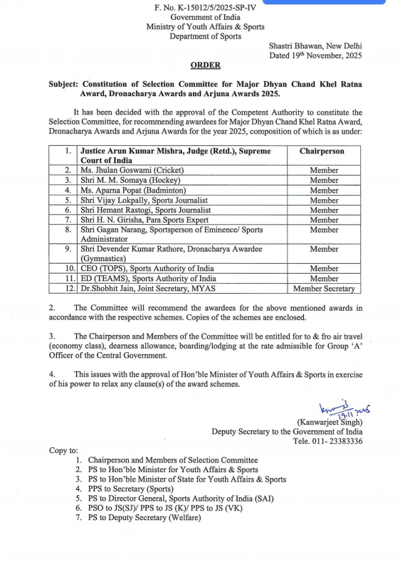 National Sports Awards 2025: जारी अधिसूचना के अनुसार, समिति की अध्यक्षता सुप्रीम कोर्ट के पूर्व न्यायाधीश जस्टिस अरुण कुमार मिश्रा करेंगे। समिति में विभिन्न खेलों से जुड़ी प्रतिष्ठित हस्तियों, दिग्गज खिलाड़ियों, अनुभवी कोचों और वरिष्ठ खेल पत्रकारों को शामिल किया गया है। सदस्यों में झूलन गोस्वामी (क्रिकेट), एम. एम. सोमैया (हॉकी), अपर्णा पॉपट (बैडमिंटन), गगन नारंग (ओलंपियन), एच. एन. गिरीशा (पैरा स्पोर्ट्स विशेषज्ञ) और देवेंद्र कुमार राठौर (जिम्नास्टिक्स एवं द्रोणाचार्य अवार्डी) प्रमुख रूप से शामिल हैं। इसके अलावा, खेल पत्रकार विजय लोकपल्ली और हेमंत रस्तोगी भी समिति का हिस्सा होंगे।