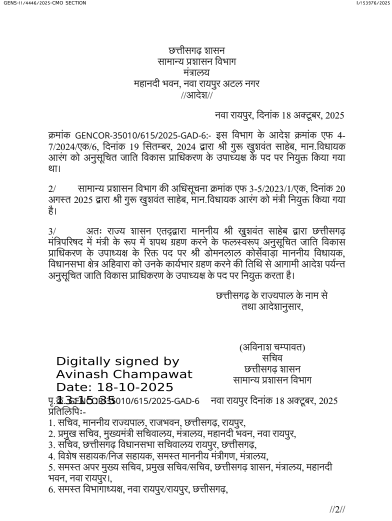 जारी आदेश में उल्लेख किया गया है कि “राज्य शासन एतद्वारा गुरु खुशवंत साहेब द्वारा छत्तीसगढ़ मंत्रिपरिषद में मंत्री पद की शपथ लेने के फलस्वरूप अनुसूचित जाति विकास प्राधिकरण के उपाध्यक्ष के रिक्त पद पर डोमनलाल कोर्सेवाड़ा, विधायक अहिवारा को उनके कार्यभार ग्रहण करने की तिथि से आगामी आदेश पर्यंत नियुक्त किया जाता है।”