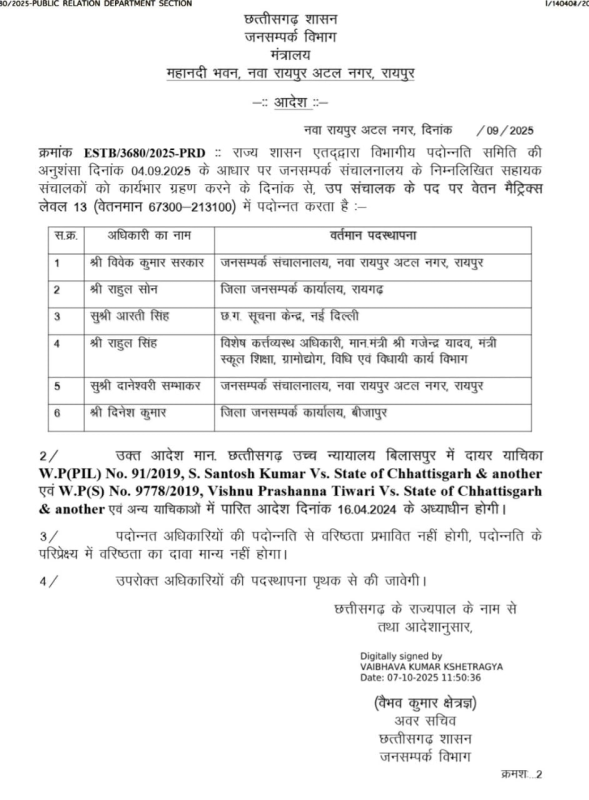 Raipur City News : दिवाली से पहले जनसंपर्क विभाग में अधिकारियों को तोहफा, 6 सहायक संचालक बने उप संचालक