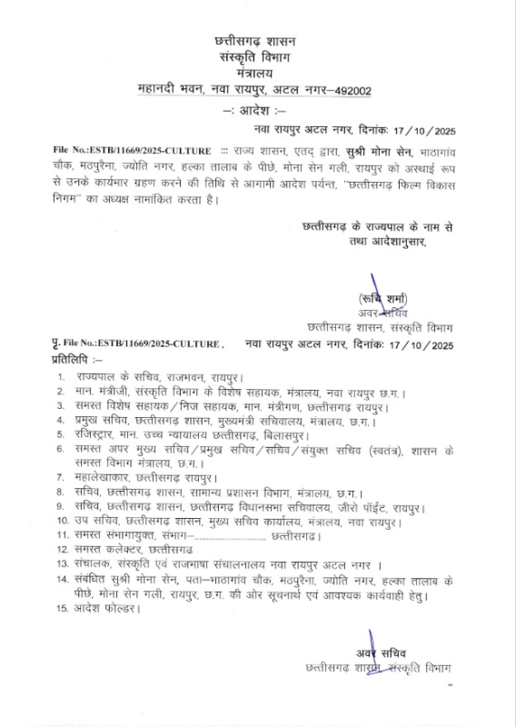 Raipur City News : छत्तीसगढ़ फिल्म विकास निगम की नई अध्यक्ष बनीं मोना सेन, संस्कृति विभाग ने जारी किया आदेश