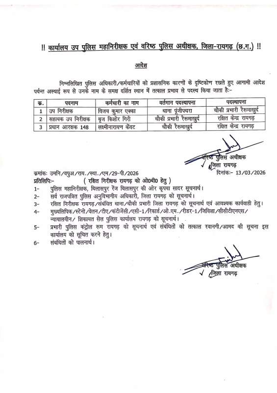 Raipur City News : रायगढ़। जुआ खेले जाने की सूचना को गंभीरता से नहीं लेने और वरिष्ठ अधिकारियों को स्पष्ट जानकारी नहीं देने के मामले में पुलिस विभाग ने सख्त कार्रवाई की है। चौकी रैरूमाखुर्द के प्रभारी एएसआई बृज किशोर गिरी और बीट के प्रधान आरक्षक लक्ष्मी नारायण केंवट को तत्काल प्रभाव से लाइन अटैच कर दिया गया है।