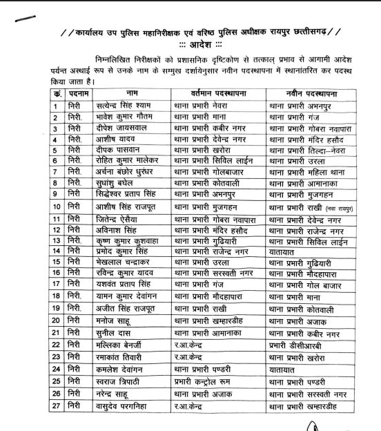 Raipur Police Transfer : रायपुर पुलिस में बड़ा फेरबदल, 27 थाना प्रभारियों का तबादला, देखें पूरी लिस्ट...