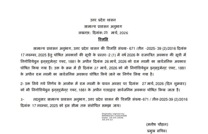 Ram Navami: लखनऊ: रामनवमी के अवसर पर उत्तर प्रदेश सरकार ने अहम फैसला लेते हुए पहले से घोषित 26 मार्च के सार्वजनिक अवकाश के साथ 27 मार्च को भी अतिरिक्त छुट्टी घोषित कर दी है। मंदिरों में इस पर्व के दौरान श्रद्धालुओं की भारी भीड़ को देखते हुए यह निर्णय लिया गया है, ताकि लोगों को किसी प्रकार की असुविधा न हो और व्यवस्थाएं बेहतर तरीके से संचालित की जा सकें।